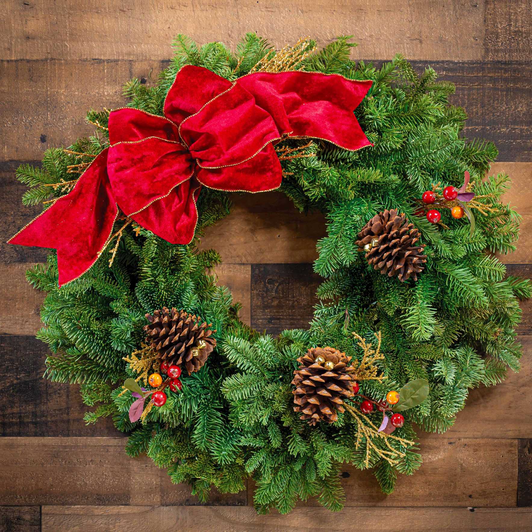 These festive wreaths feature a luxurious gold-trimmed, wired fabric bow at the center. Faux cranberry sprigs, large natural pinecones, and gold jingle bells add holiday cheer and festive charm, creating a vibrant seasonal favorite.