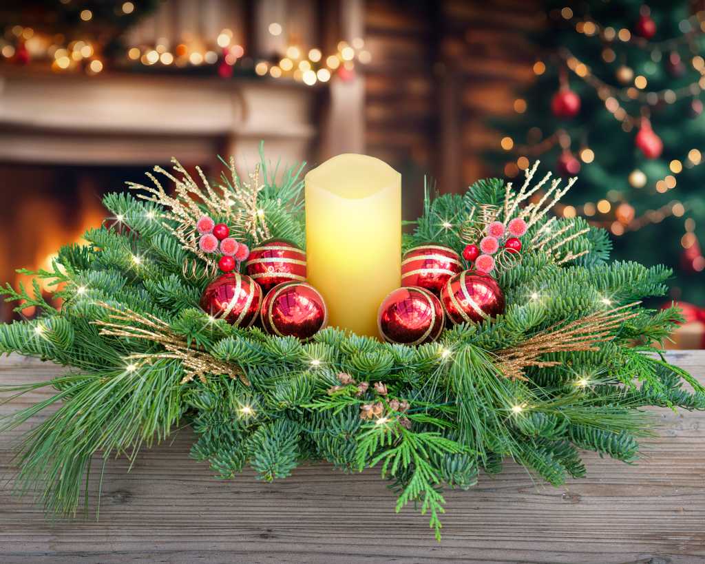 This centerpiece is bursting with naturally scented mixed evergreens which stay fresh and moist from the floral foam base. Near the warm glow of the LED wax candle, elegant decorations of gold-banded red bulbs and frosted berries lay nestled amongst complementary accents of gold. Embellish your centerpiece with the included LED light set to add even more whimsy and charm to your table! (Includes LED candle and light set)