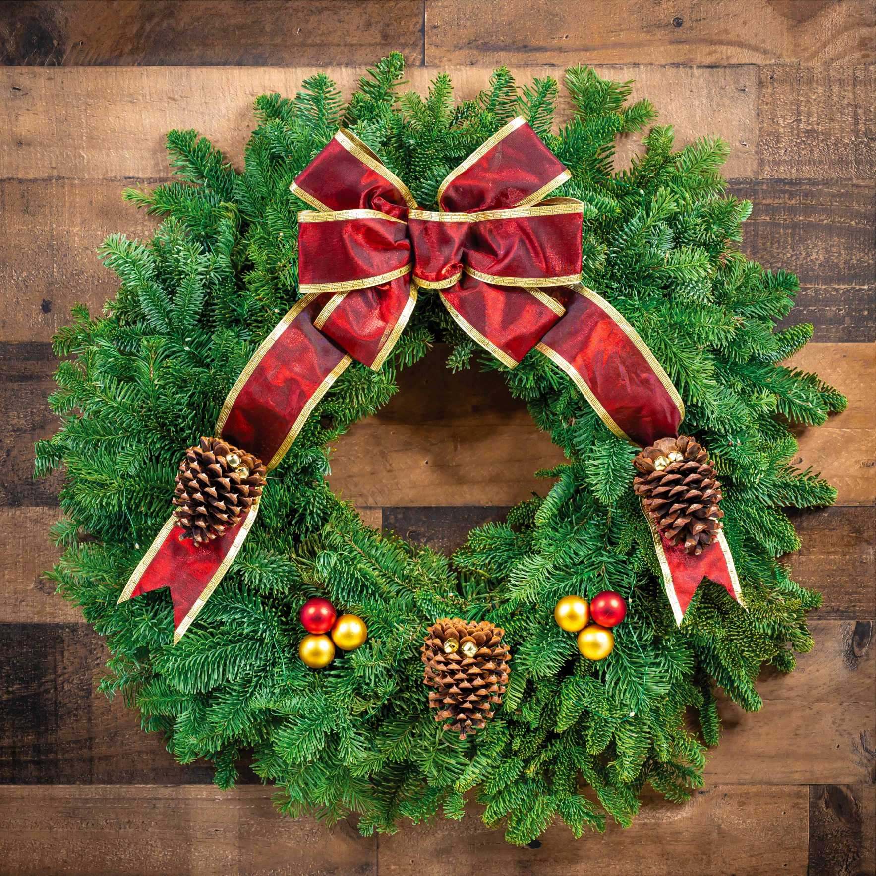 These elegant Victorian wreaths feature a gold-trimmed, wired satin bow with seven lavish loops and long flowing tails. Large natural pinecones, gold jingle bells, and sparkling ornament sets complete the look.