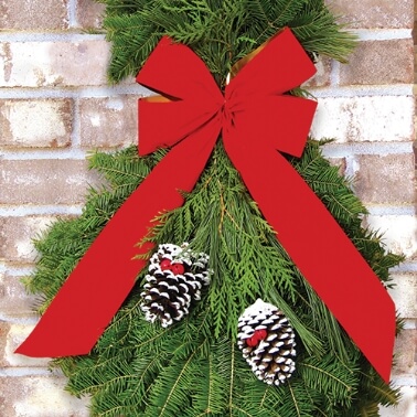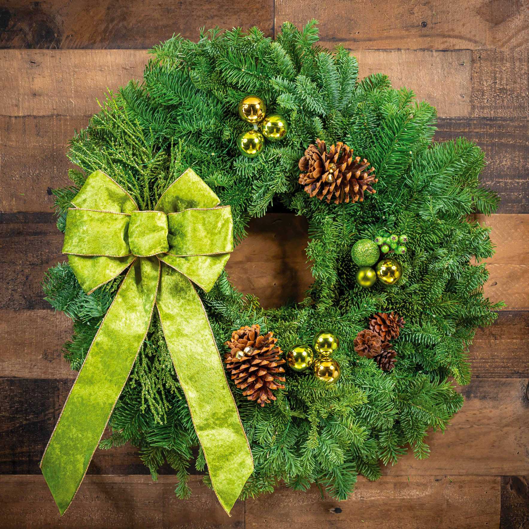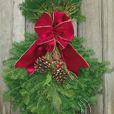 These elegant Victorian wreaths feature a gold-trimmed, wired satin bow with seven lavish loops and long flowing tails. Large natural pinecones, gold jingle bells, and sparkling ornament sets complete the look.
