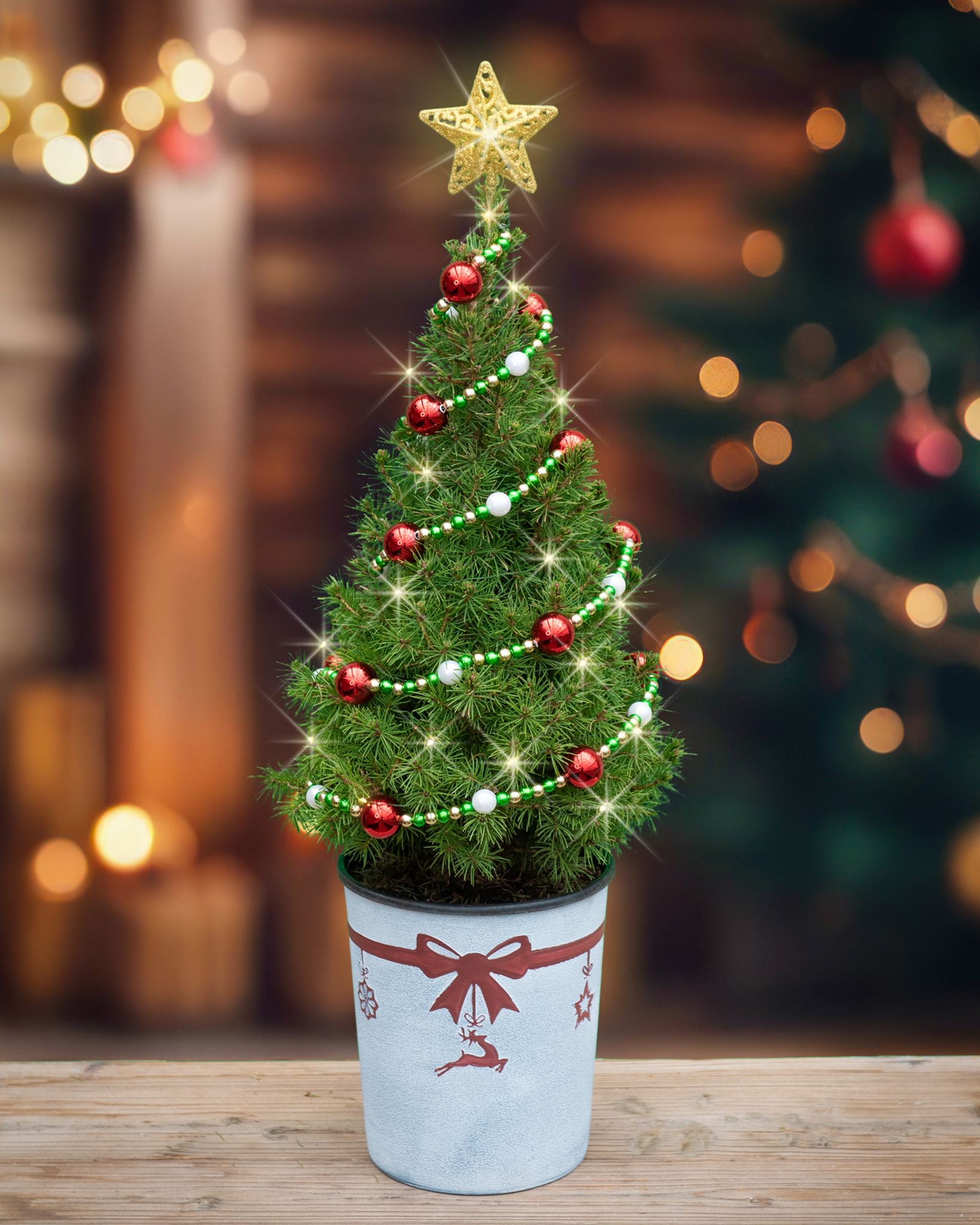 This Dwarf Alberta Spruce arrives adorned with seven frosted and glittered pinecones, a glittered gold star garland, a star tree-topper, and an LED light set (3 AAA batteries not included). Grown in nurseries, these trees remain fresh and vibrant throughout the holidays with regular watering, and can be planted outdoors afterward to enjoy for years to come.